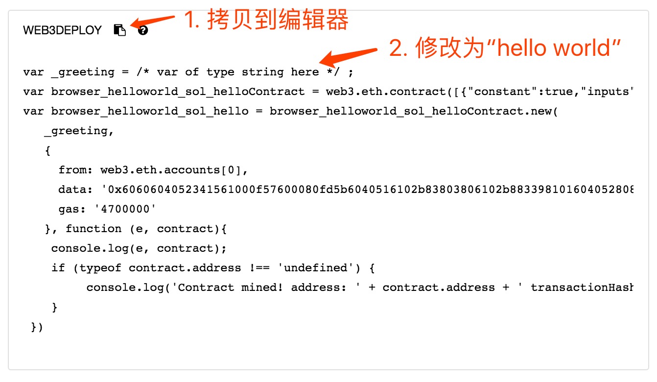 在弹出的对话框中找到WEB3DEPLOY部分,点拷贝,粘贴到编辑器后,修改初始化字符串为hello world。