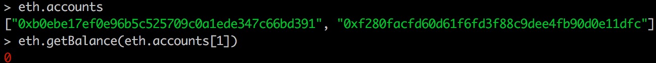 1 | > eth.getBalance(eth.accounts[1]) |