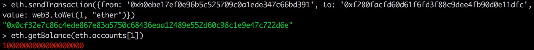 1 | eth.sendTransaction({from: '0xb0ebe17ef0e96b5c525709c0a1ede347c66bd391', to: '0xf280facfd60d61f6fd3f88c9dee4fb90d0e11dfc', value: web3.toWei(1, "ether")}) |
