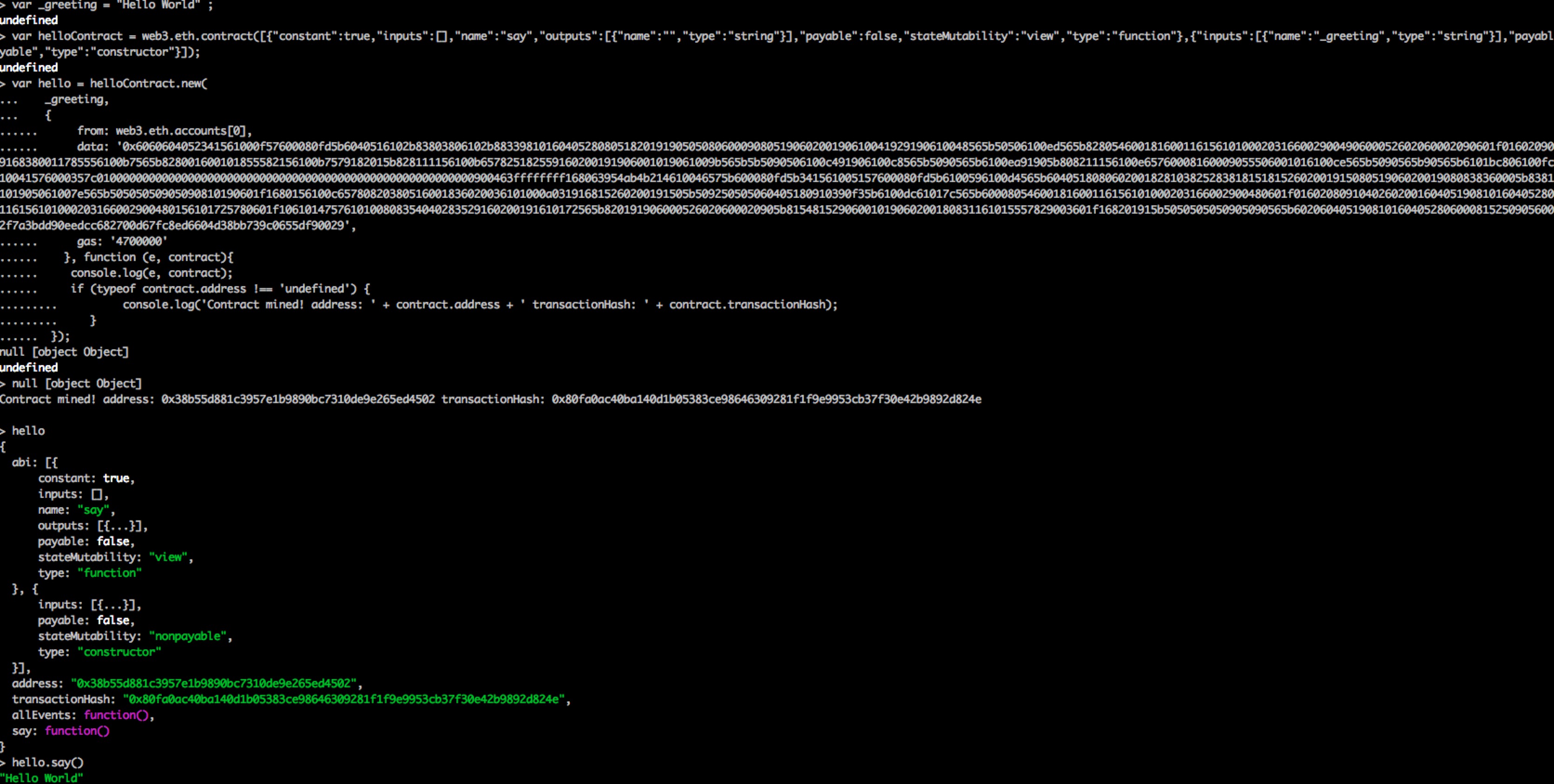 简单解释下,我们定义了一个名为hello的合约,在合约初始化时保存了一个字符串(我们会传入hello world),每次调用say返回字符串。