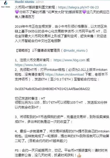 群管理员首先会发布群公告教用户如何搬砖,然后引导用户下载imToken钱包并购买ETH,并引导用户将ETH打到公告中提及的ETH地址,最后诈骗者通过合约地址,返还给用户一定数量的虚假HT。