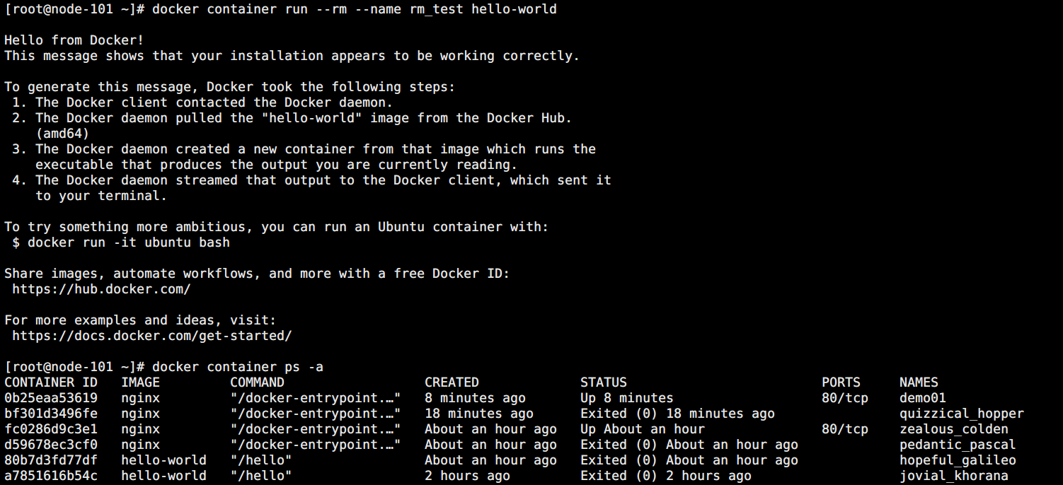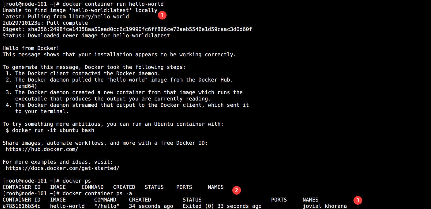 hello-world 容器是一个测试容器,在输出一些文字之后就会退出,通过这个过程,我们可以发现: