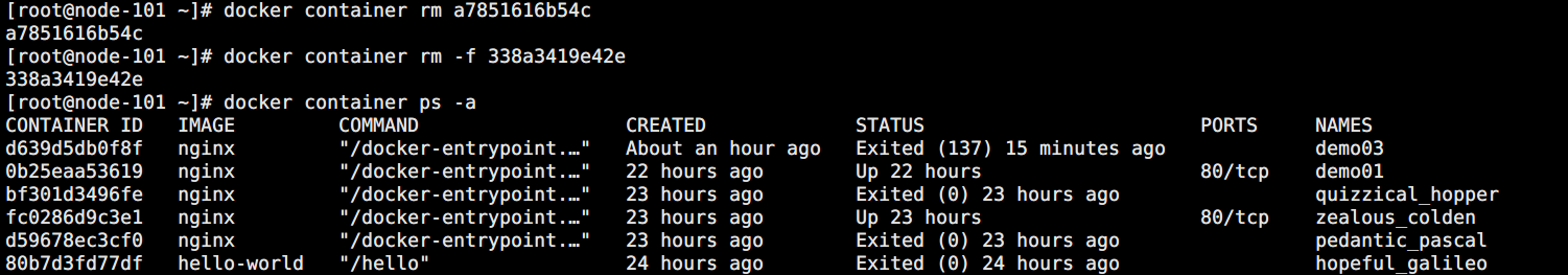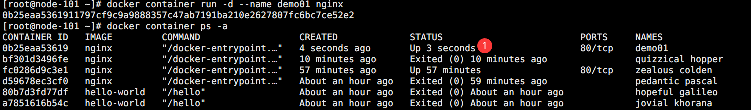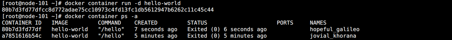 可以发现,hello-world 容器加了 -d 参数后不在输出它的信息,只是返回了一长串字符,其实就是完整的 Container ID,用法类似 Image ID。