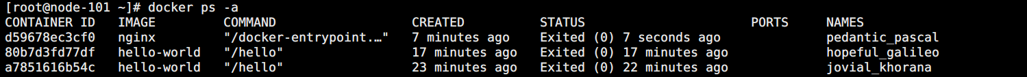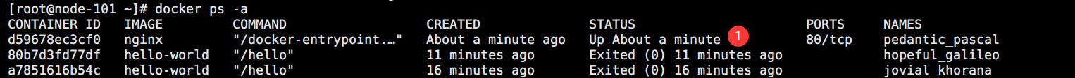使用此方法只能看到运行中的容器,对于以及停止的容器,还需要使用-a参数,比如:
