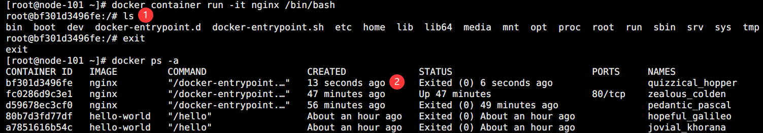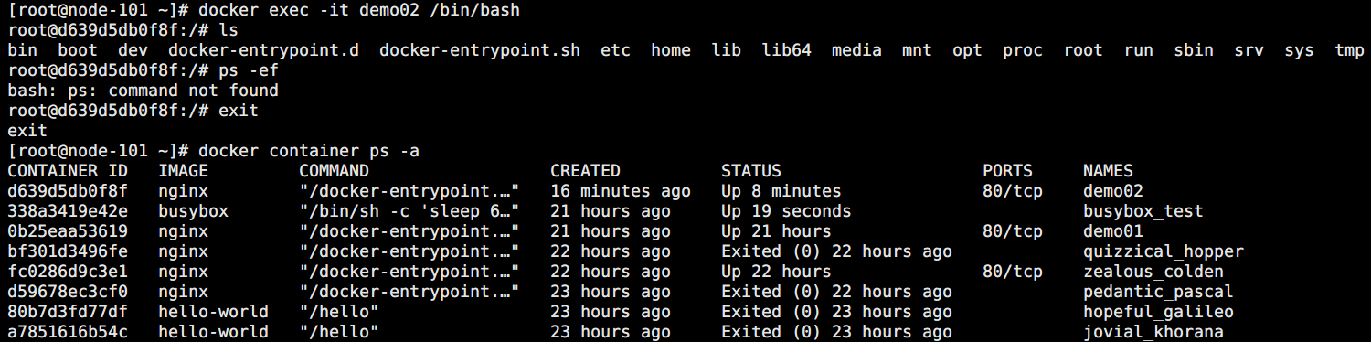 - 当退出容器命令行,容器也跟着退出。原因是我们重写容器内部的命令为 bash 之后,nginx 就没有启动了,当退出 bash 之后,容器内部就没有进程了,所有容器就退出了。