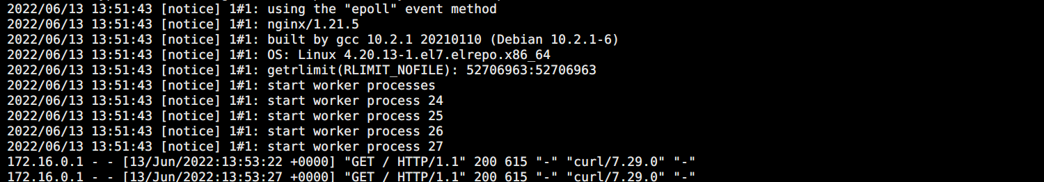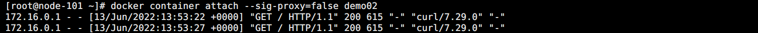 该命令会对容器进行监听,命令行处于交互式界面,此时从新窗口请求该容器的 nginx: