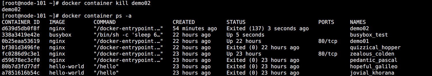 该命令相较于 stop 更暴力杀死一个或多个容器: