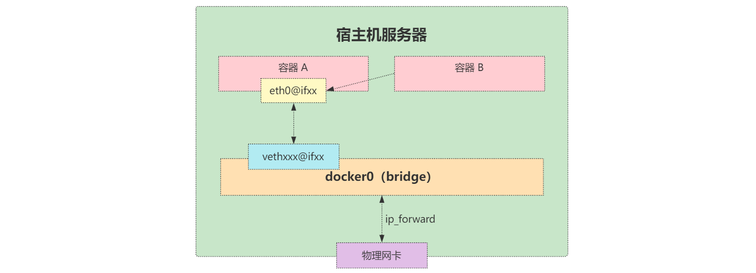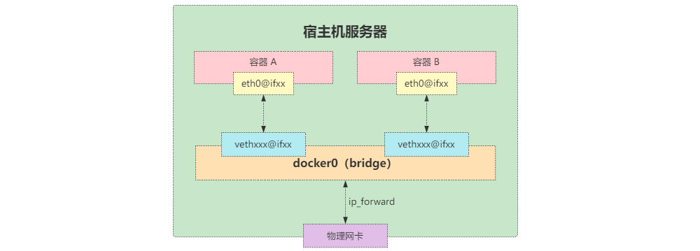docker 安装完后会在宿主机创建一个 docker0 虚拟网卡。其作用类似于网络交换设备,用于实现容器之间,容器与宿主机之间甚至容器与外部主机之间的通信