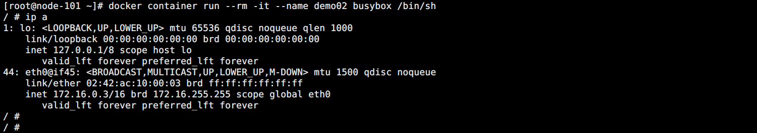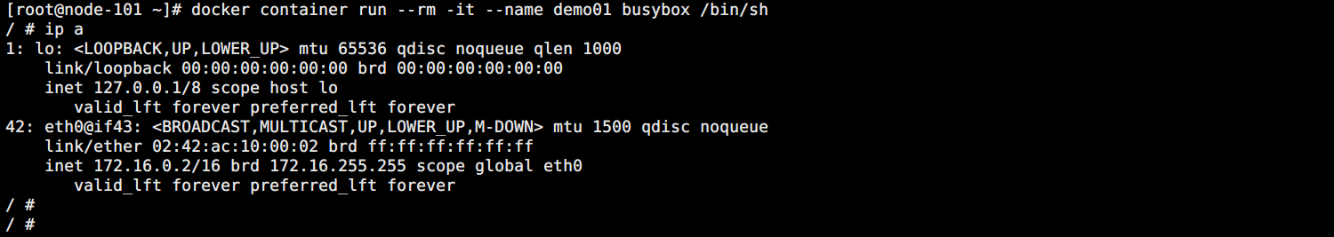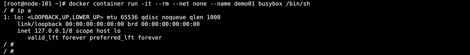1 | docker container run -it --rm none --name demo01 busybox /bin/sh |