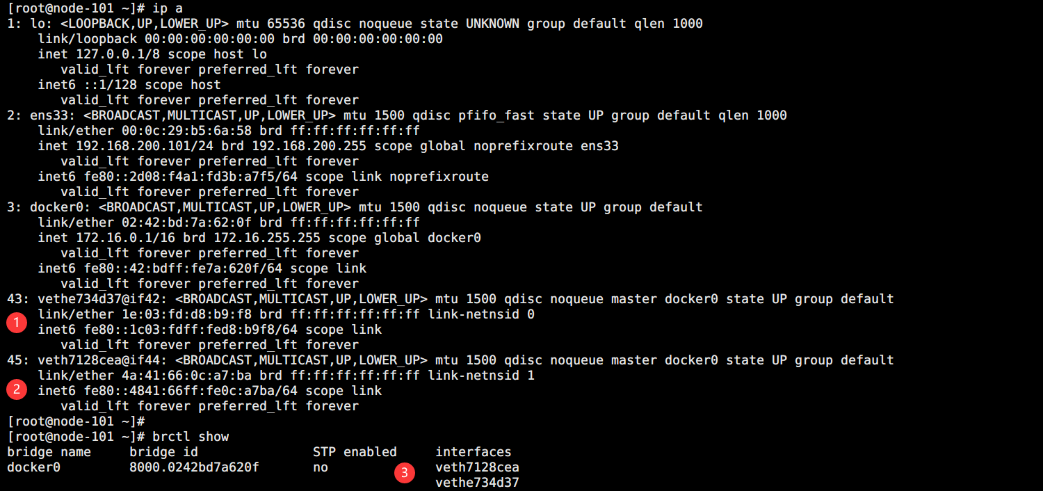 宿主机多了两个 veth 网卡,这两个网卡就是和容器内部的 eth0 成对出现的,通过 bridge-utils 提供的命令也可以看到它们和 docker0 的连接关系。