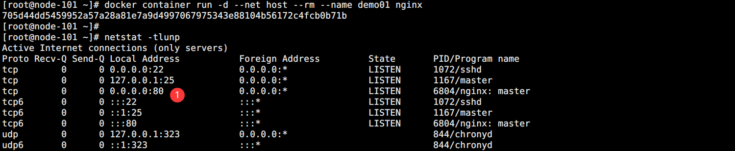 1 | docker container run -d --net host --rm --name demo01 nginx |