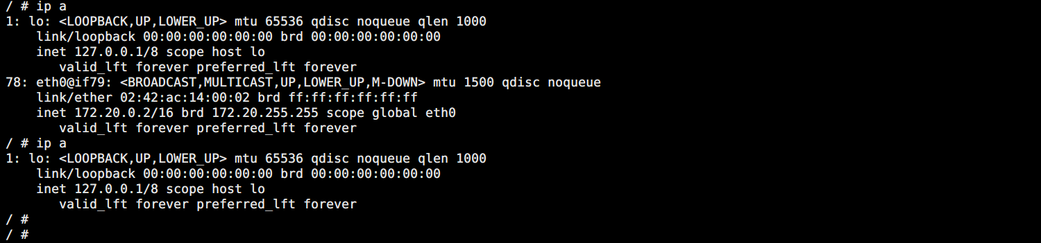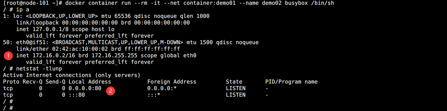 1 | docker container run --rm -it --net container:demo01 --name demo02 busybox /bin/sh |