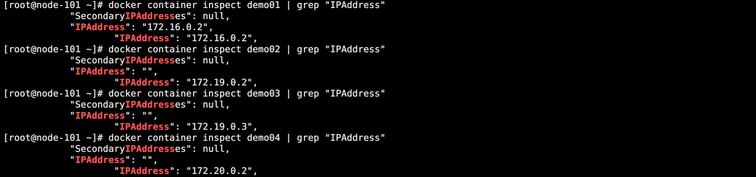 可以发现 IP 多了一些的新的网段,同一网络模式的容器处于同一网段。