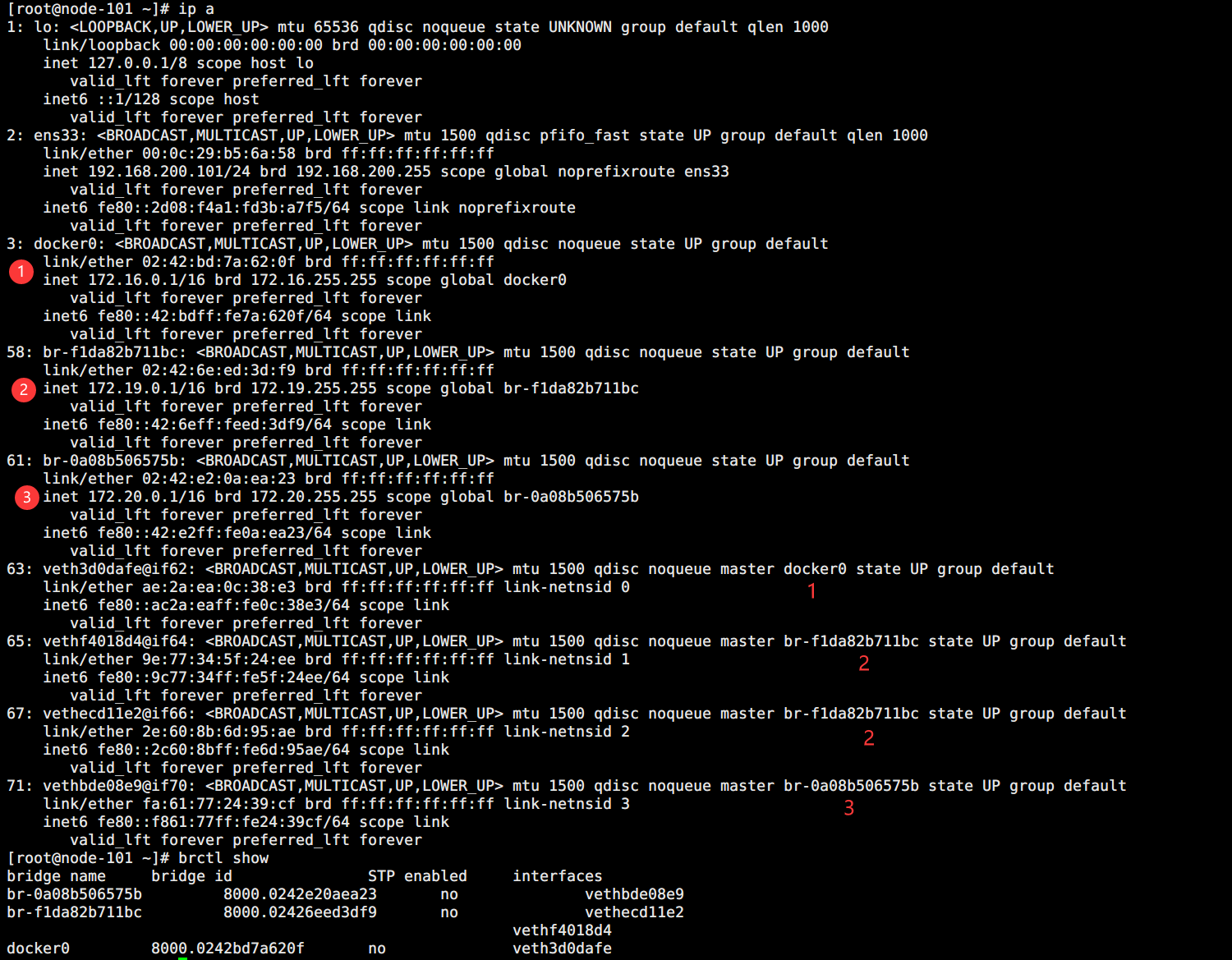 可以发现多了两个类似于 docker0 网桥的网卡,都分配了新的网段。由此可以知道,每新建一个 bridge 网络,就会在宿主机新建一个 bridge 网桥,并分配一个新的网段。