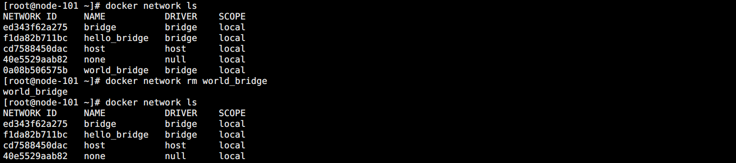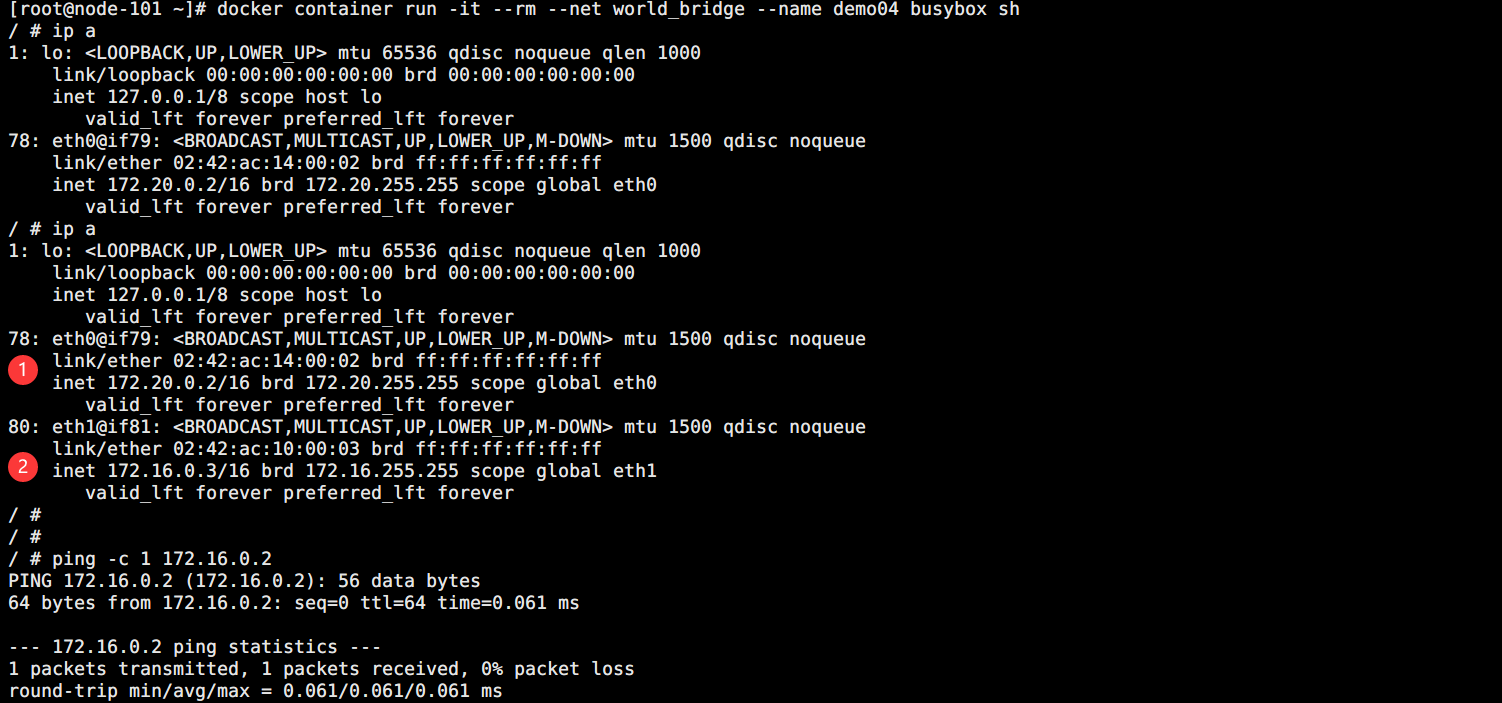 可以发现限制 demo04 容器既属于默认 bridge 网络,也属于 world_bridge 网络了,这也就能和默认网络的 demo01 进行通信。