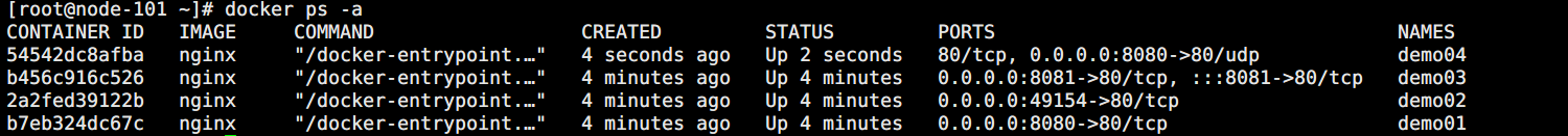 1 | docker container run -d --rm -P --name demo01 nginx |